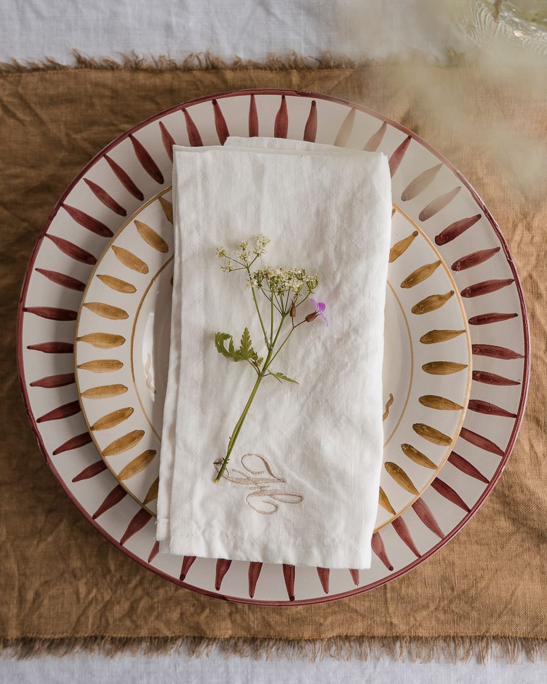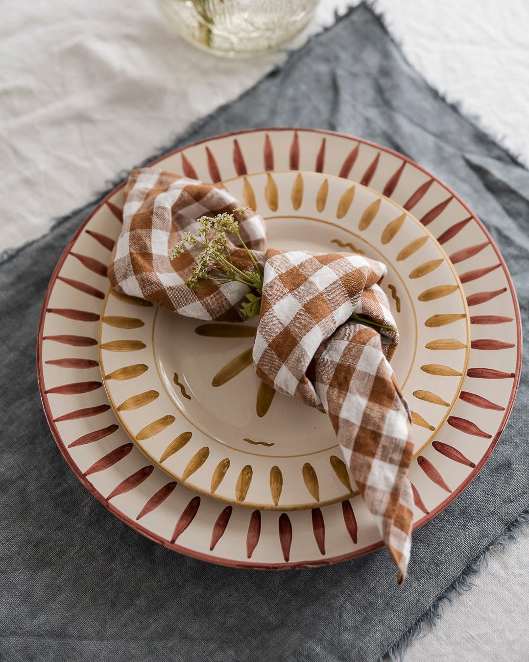 Når vi samles til måltidene, liker jeg å dekke bordet med rustikk sjarm. Serviset i håndmalt keramikk fra Italia setter tonen, og med linduker og linservietter får måltidene en avslappet og inviterende atmosfære – enkelt, men gjennomført. Det er disse små detaljene som gjør at en helt vanlig middag oppleves som noe mer enn bare hverdag.
