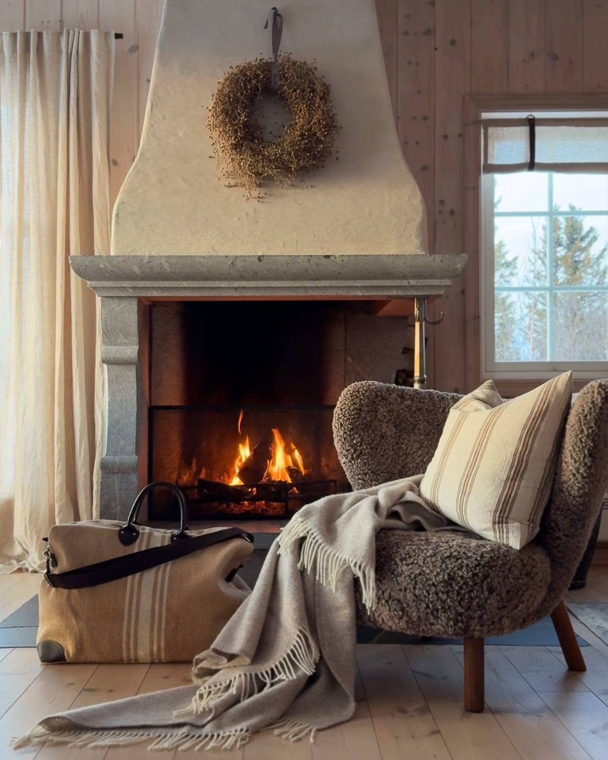 Når høsten kommer, får også jeg behov for lune, dempede farger og myke tekstiler. Pynteputer i lys lin med striper i dempet okergult og sort speiler høstfargene utenfor vinduet. Og myke pledd må man jo bare ha. Når kvelden faller på, pakker jeg meg inn i et klassisk ullpledd – lett, varmt og akkurat slik et pledd skal være. Uten dikkedarer, bare den tidløse kvaliteten som aldri går av moten.