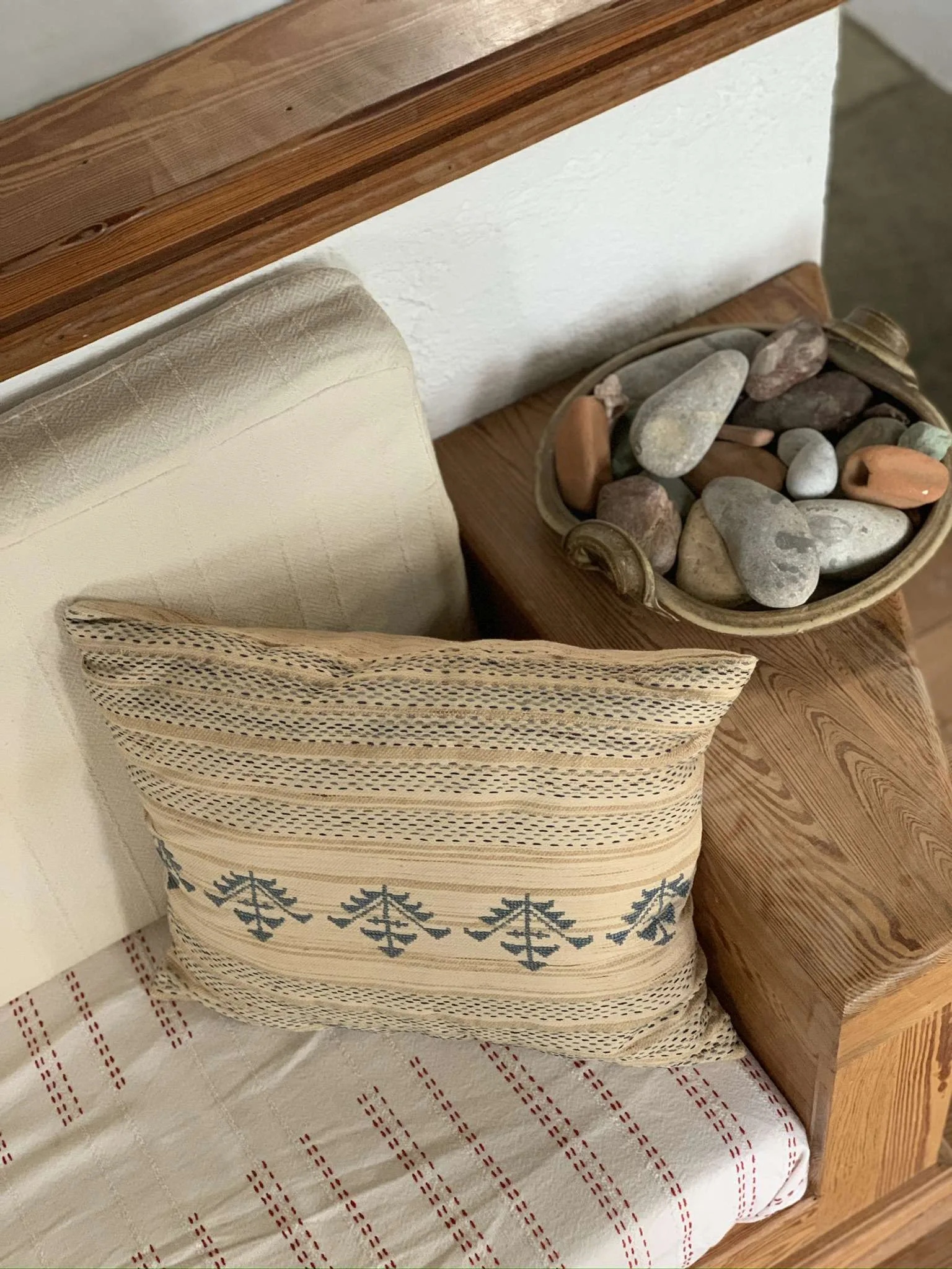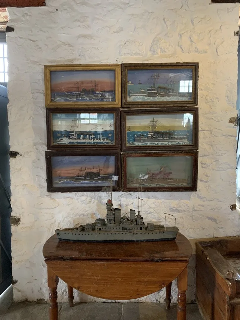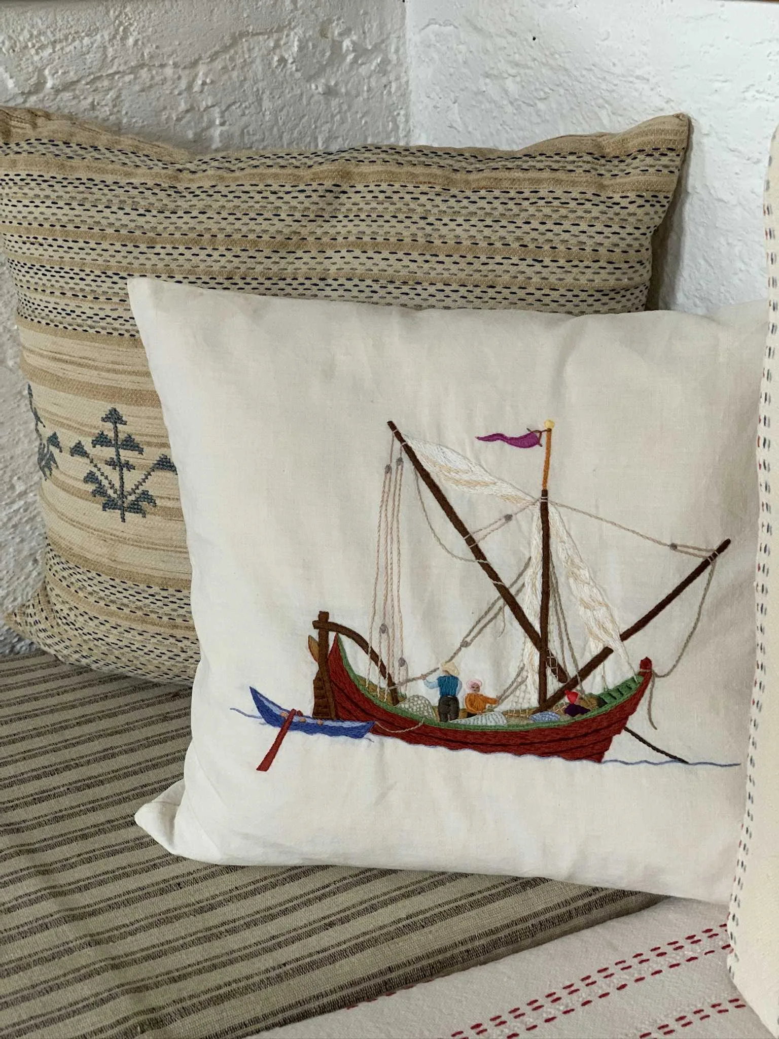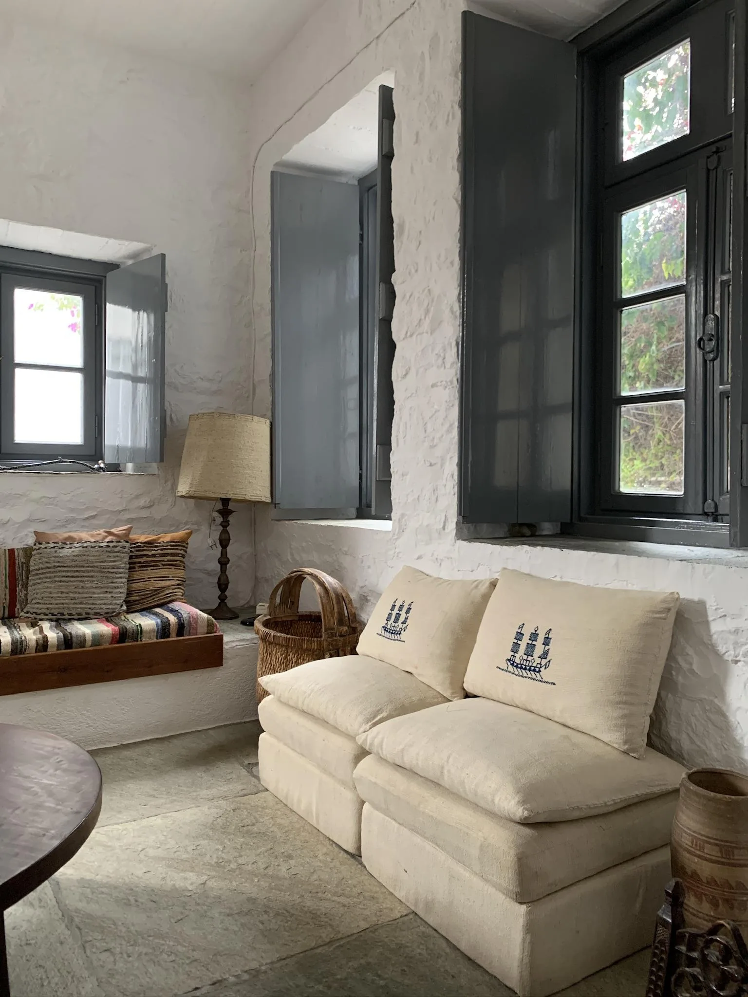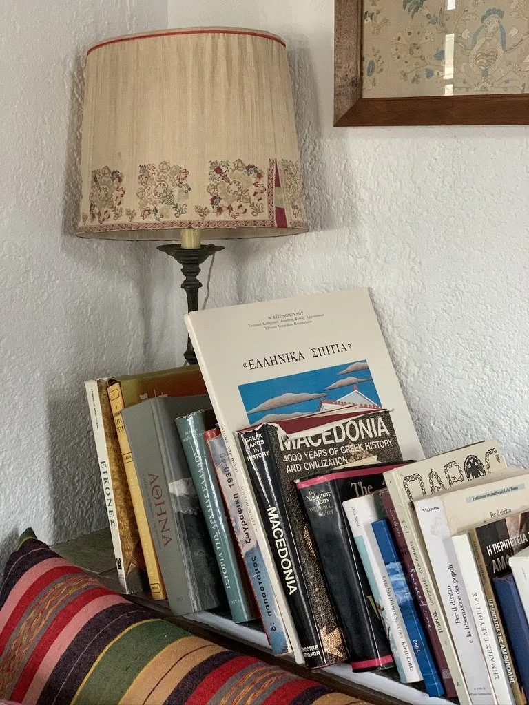 Som så mye annet på Hydra, er det ikke det perfekte som gjør inntrykk, men stemningen. Huset til Dimitris fikk meg til å tenke på den norske arkitekten Wenche Selmer, en av mine store helter. Hun designet utvendig og innvendig med tanke på at det skulle være plass til kun det som trengtes for å leve. Og når vi summerer litt, så er det egentlig ikke så mye vi trenger. Dimitris hus er litt sånn. Huset rommer tre soverom hvorav ett litt mindre, men de to andre er til gjengjelde store og romslige, alle med hvert sitt bad, behagelig romslige oppholdsrom og stor deilig terrasse med utsikt utover byen og havet. Jeg tok meg selv i å bare gå rundt og titte på alt som var samlet i enkle bokhyller, på et bord, i en bolle. På enkle sofaløsninger med håndbroderte motiver av skip, filleryeputer og broderte lampeskjermer.