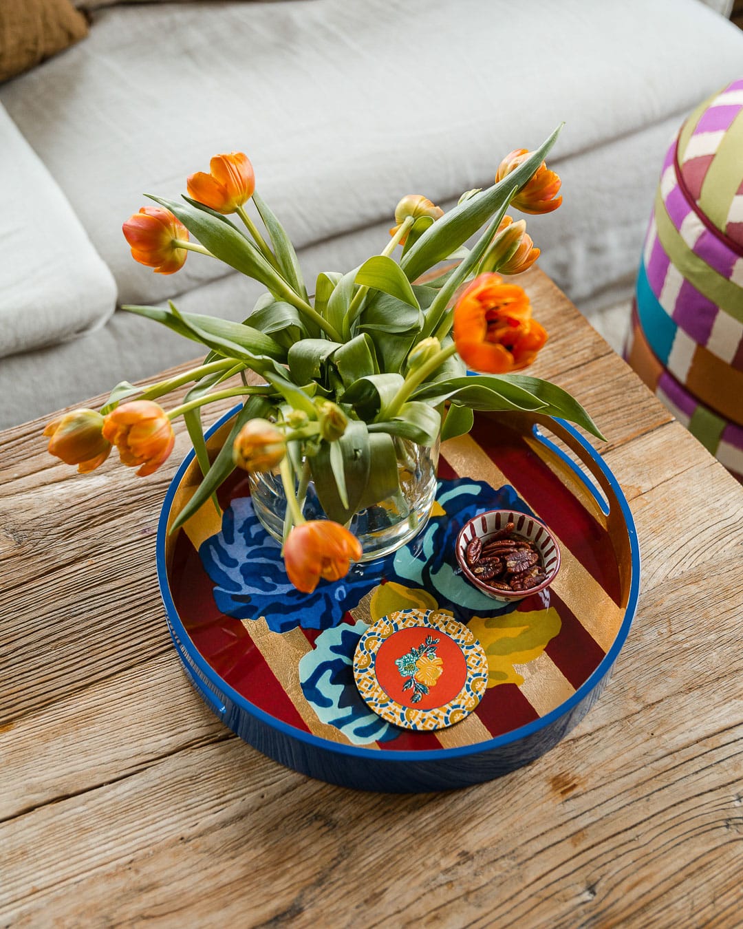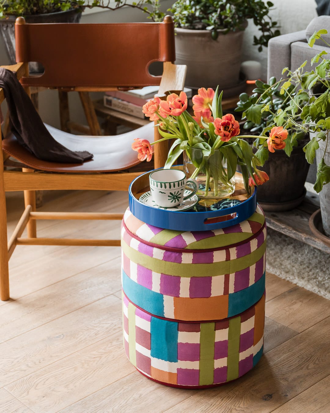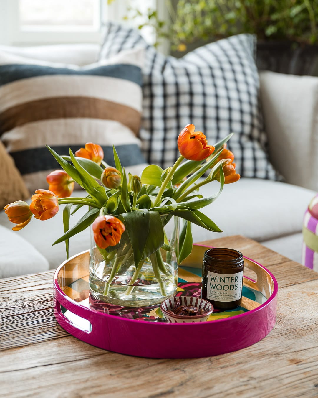 Utsnitt fra en stue. På stuebordet står en vase med tulipaner og en tekopp å et knallrosa brett. Ved siden av bordet skimter du en fargerik puff og en stol i skinn.