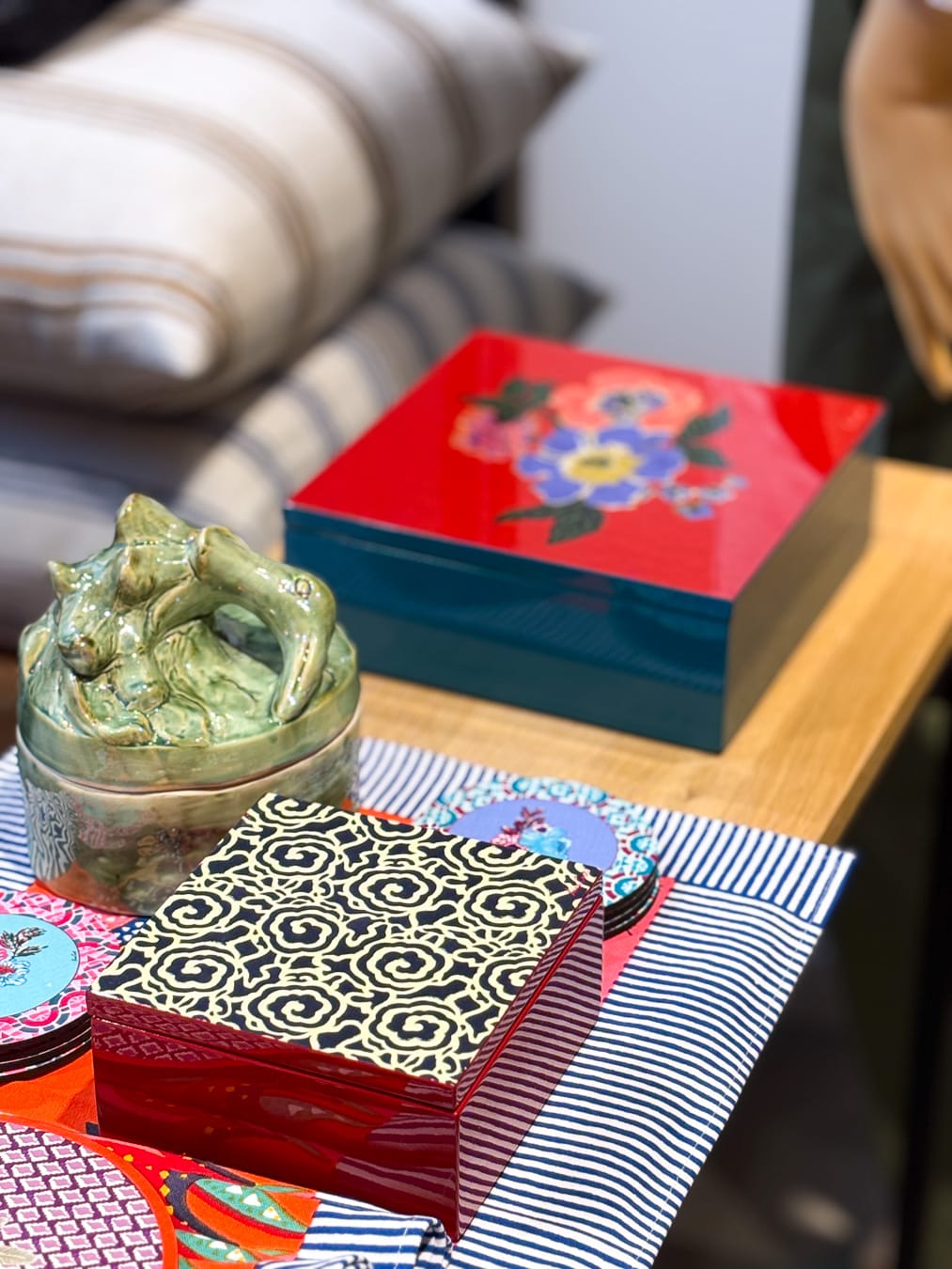 Sortimentet er allerede utvidet med puffer, servietter, duker, skrin, glassbrikker og serveringsbrett i lakkert tre. Alt i små, eksklusive opplag.