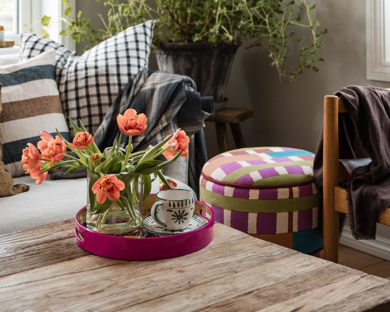 Utsnitt fra en stue. På stuebordet står en vase med tulipaner og en tekopp å et knallrosa brett. Ved siden av bordet skimter du en fargerik puff og en stol i skinn.