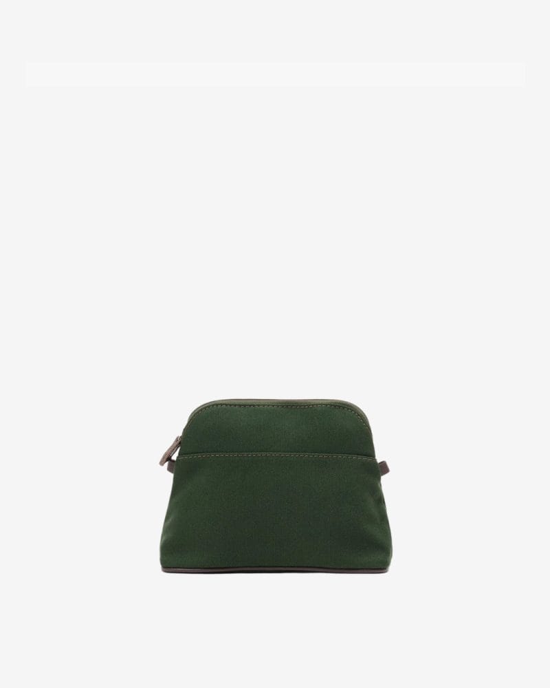 Aspen liten er en toalettmappe i mørkegrønn bomullscanvas med brune skinndetaljer. Perfekt til småting i vesken – lett, slitesterk og laget i Italia.