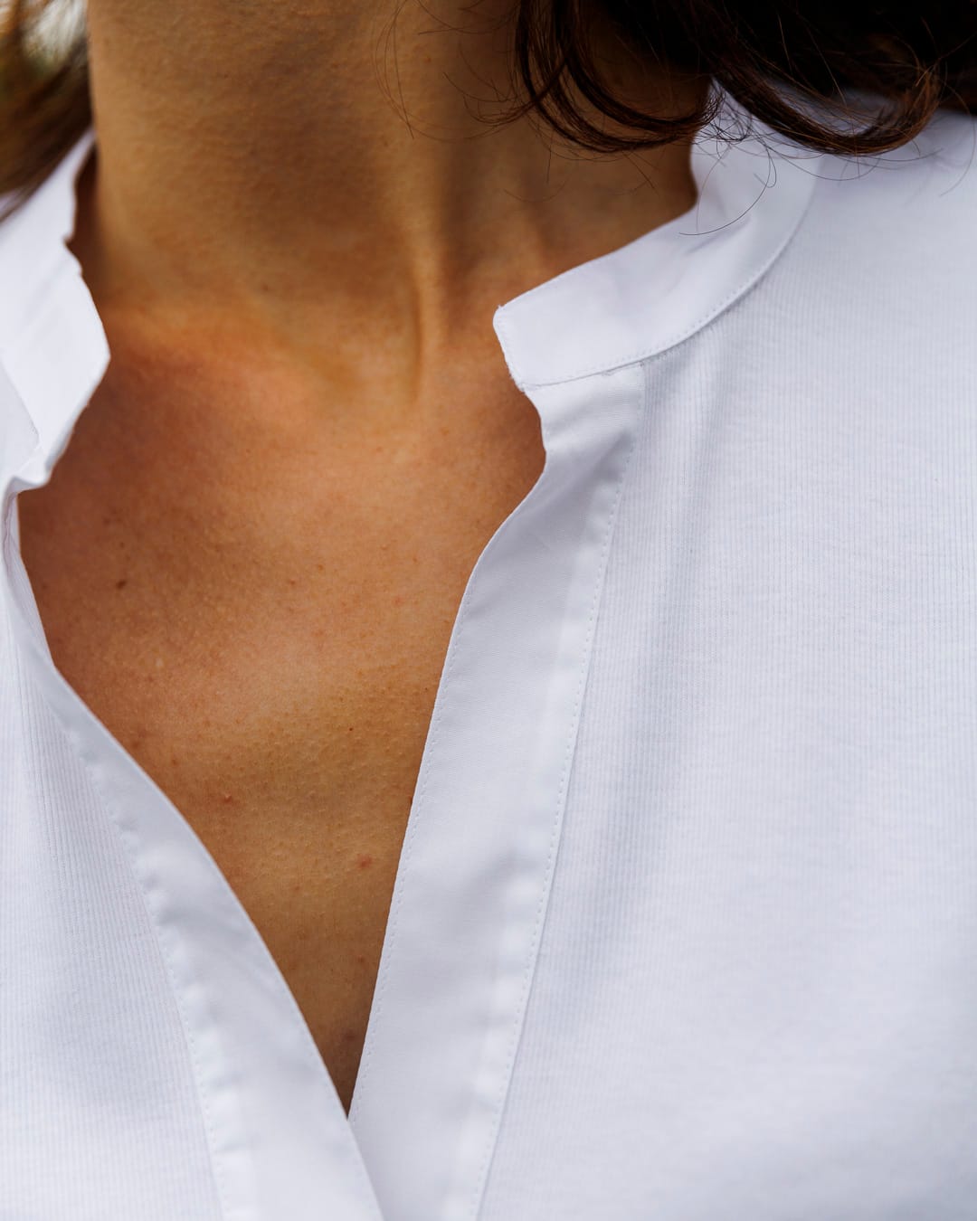 93% bomull, 7% elastan produsert i Italia Lett innsvinget i livet Rekker til under bukselinningen Stående krave og stolpefront