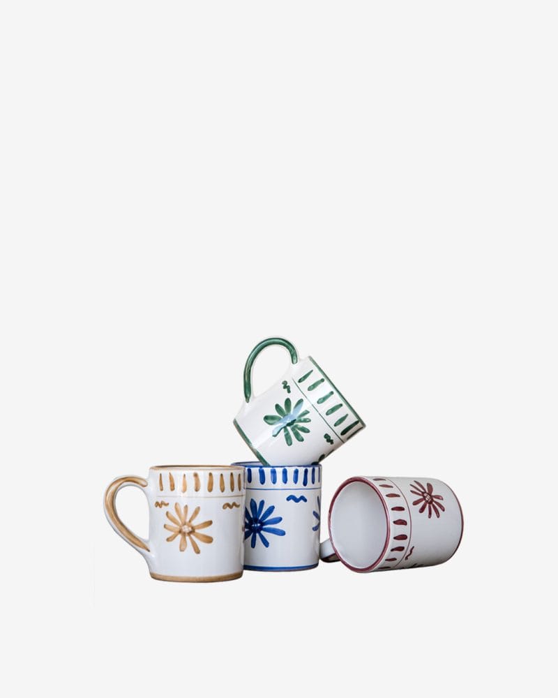 Espressokopp i rustikk keramikk. Koppene er håndmalte og håndlagde på et lite verksted i Firenze for Stories by Kine. Hver kopp er dekorert med mønster i blått, okergult, rødt eller grønt.