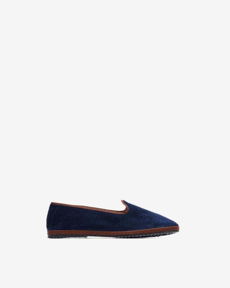 Friulane i mørkeblå fløyel med kanting i brun
