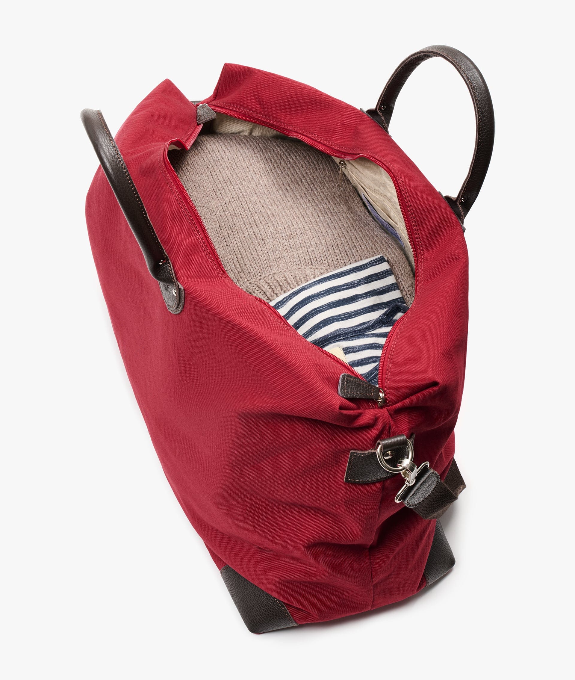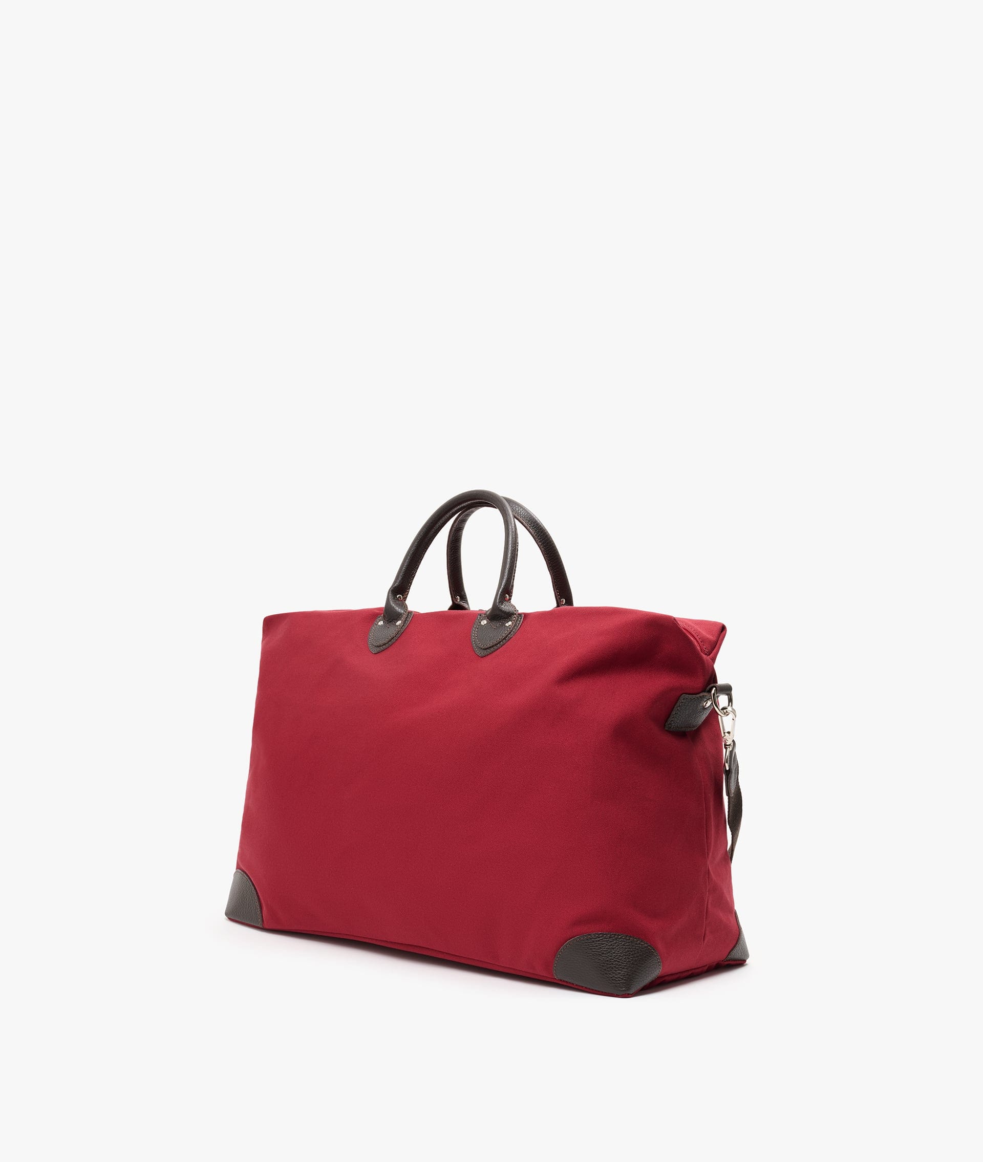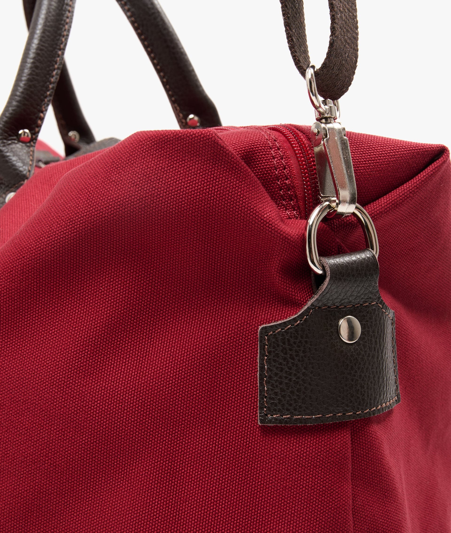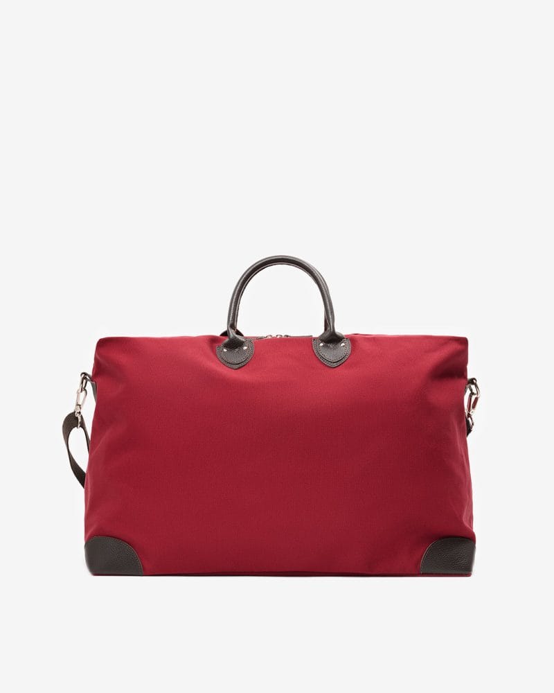 Denne modellen er laget i mørkerød bomullscanvas med mørkebrune skinn­detaljer – fra håndtak til forsterkede hjørner og justerbar skulderstropp – som gir vesken holdbarhet og klassisk eleganse.