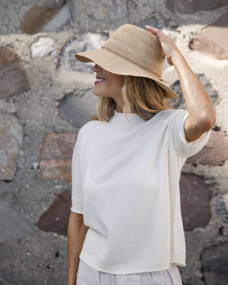 Heklet hatt i raffia med snor. I solid utførelse blir denne godt selskap med på tur i inn- og utland.