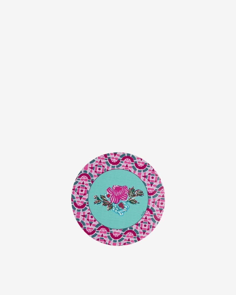 Rund glassbrikke i lilla og turkis med blomst i midsten og blomsterbord langs kanten. Glassbrikken er laget i høyglanset polyerutan. Lisa Cortis lidenskap for farger og mønstre er inspirert fra hennes barndom i Afrika, fra hyppige reiser til India og Sørøst-Asia og fra hverdagene hennes mellom Roma, Milano og Firenze. Hvert stykke stoff er trykket for hånd etter tradisjonell indisk håndtrykkerkunst.