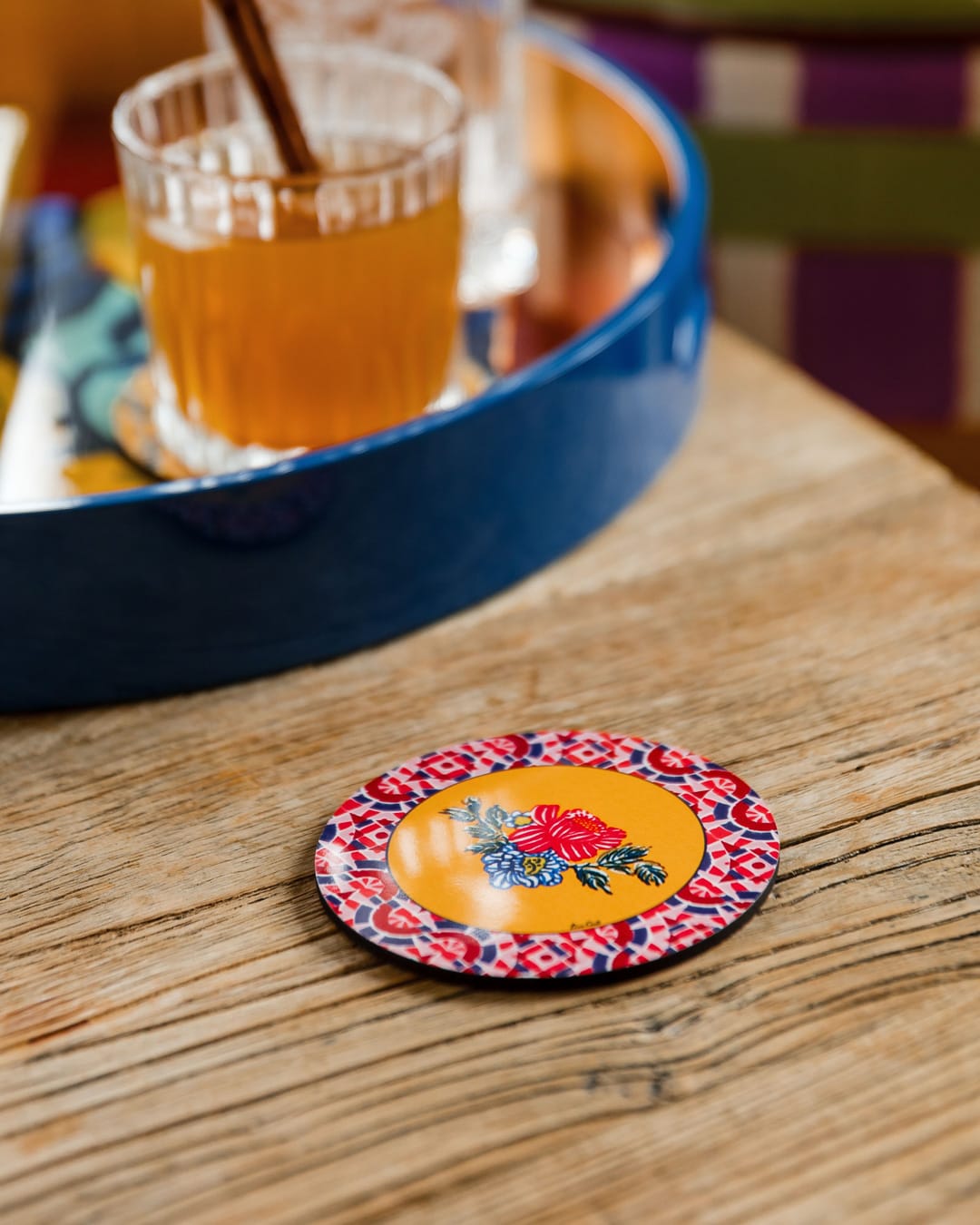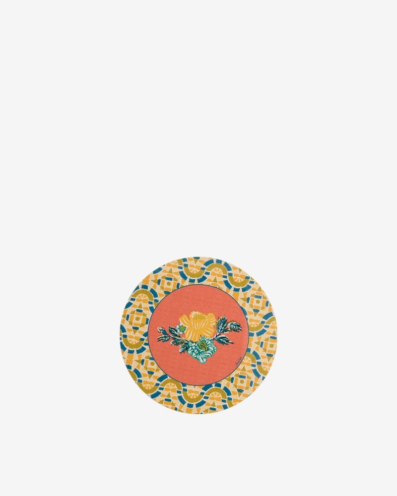 Rund glassbrikke fra Lisa Corti - lekent og funksjonelt kunstverk som kombinerer håndverk og fargeglede. Brikken er dekorert i varme nyanser av oransje og gult, med en blomst i midten og mosaikkbord langs kanten.