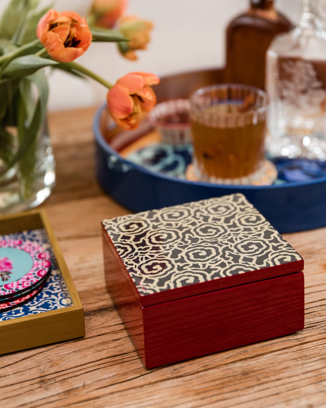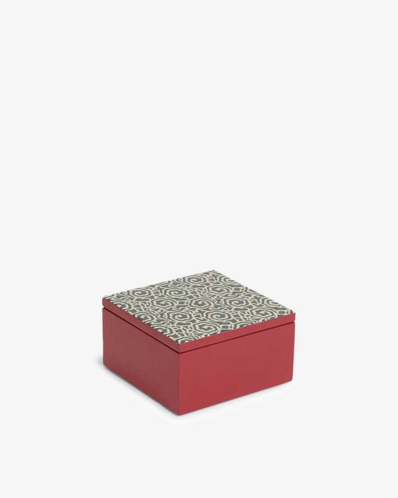 Liten dekorativ boks i rødt med lokk i sort og hvitt spiralmønster. Skrinet er laget i høyglanset polyerutan og vil bli et blikkfang i hjemmet.