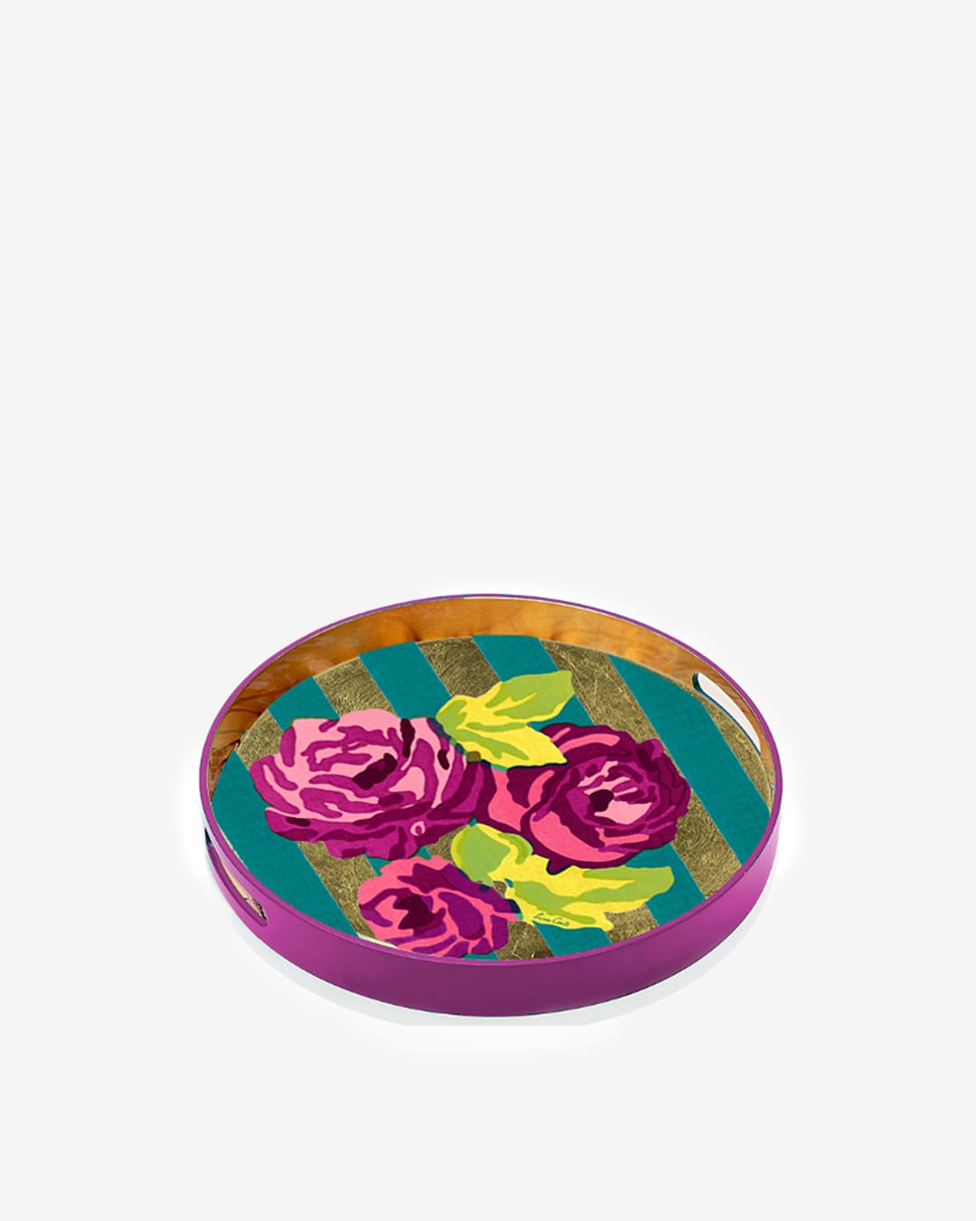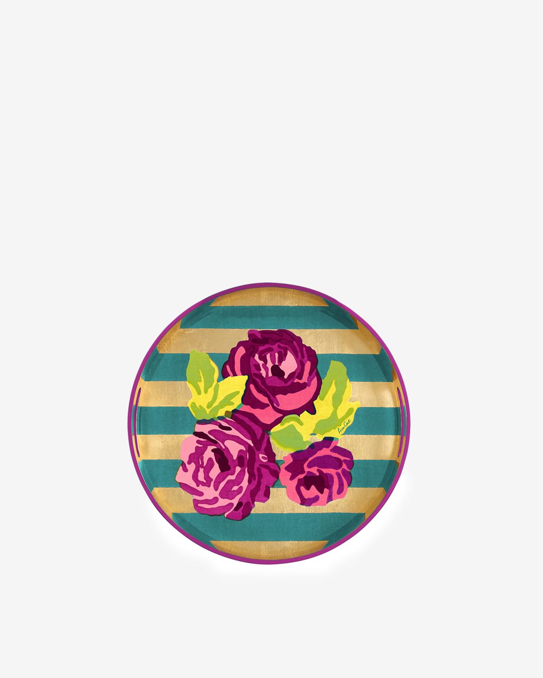 Rundt serveringsbrett fra Lisa Corti – et lite kunstverk i seg selv. Brettet er dekorert med brede striper i turkis og gull, med store mørkerosa blomster i forgrunnen – et uttrykk for Lisa Cortis særegne sans for farger og mønstre.