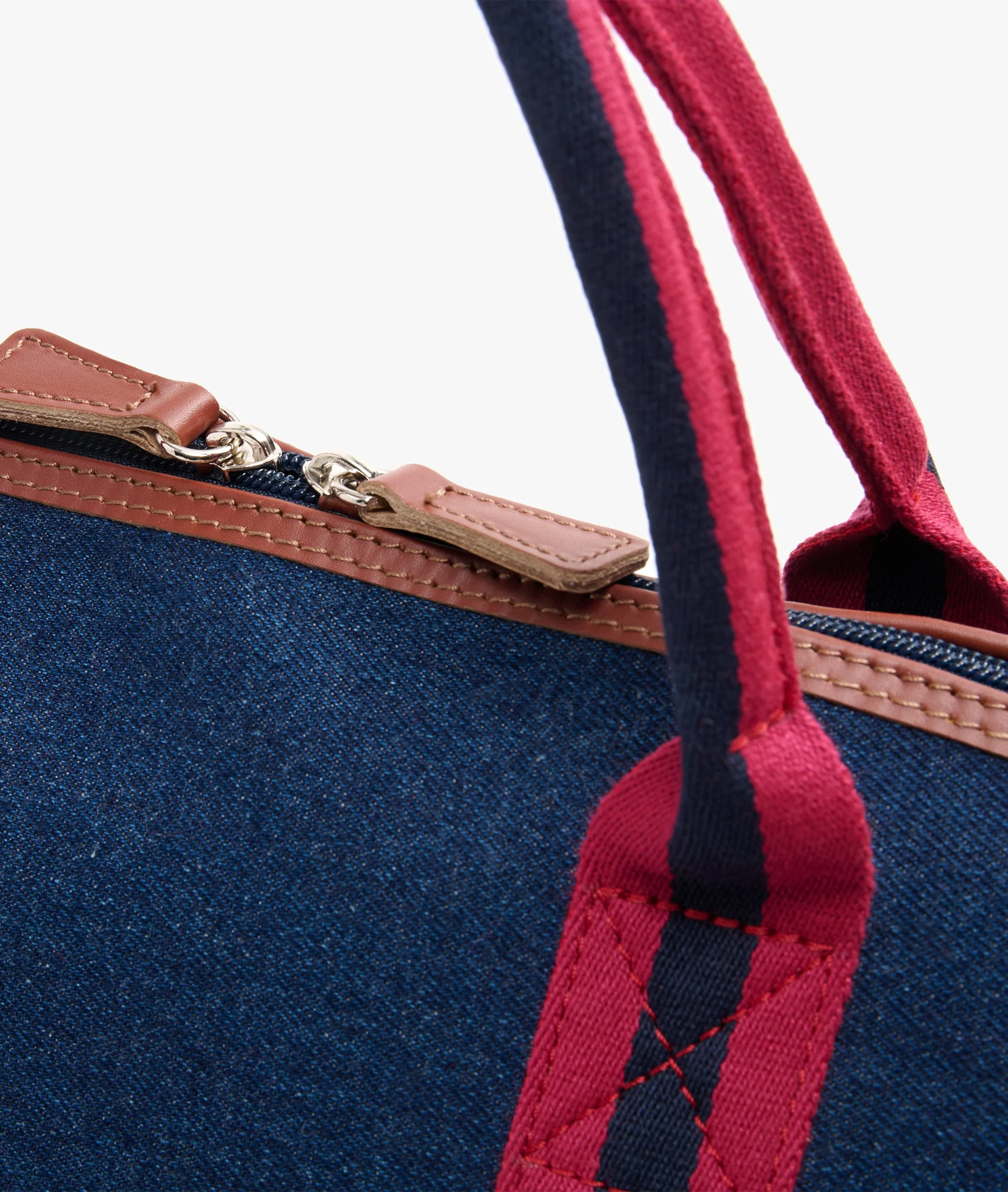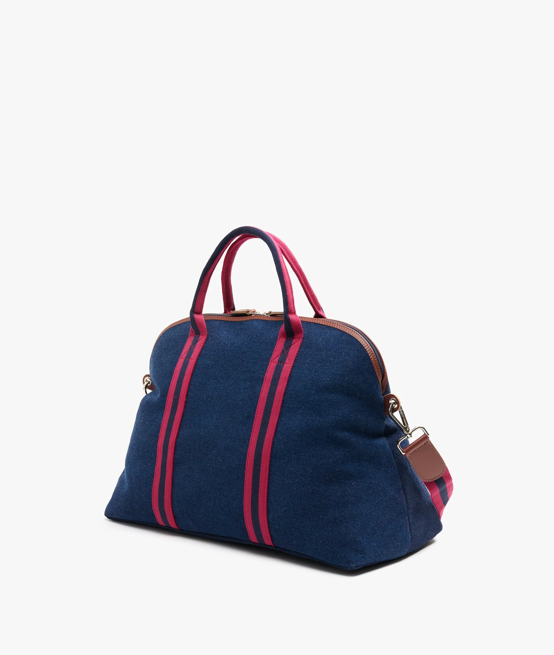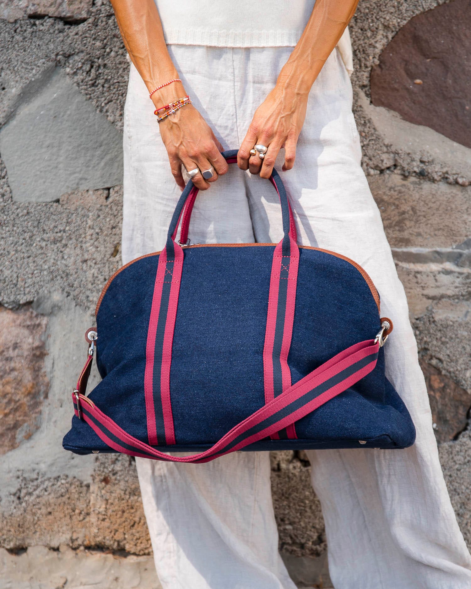 Vesken er sydd i solid canvas med to ensfargede bånd i burgunderød og grov som gir den et rent og tidløst preg. Innvendig finner du praktiske lommer i bomull, og utenpå – justerbar skulderstropp og mørkebrune skinndetaljer som setter prikken over i-en.