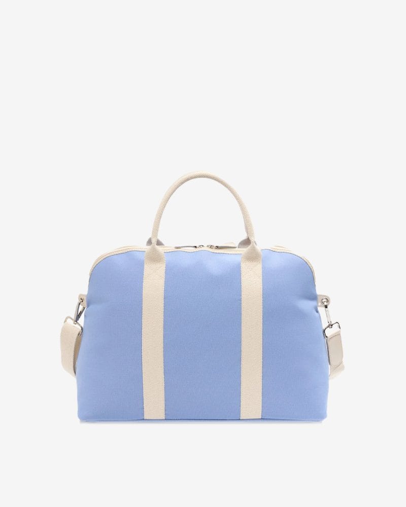 Vesken er sydd i solid canvas med to ensfargede bånd som gir den et rent og tidløst preg. Innvendig finner du praktiske lommer i bomull. Bagen har håndtak i grov bomullscanvas og justerbar skulderstropp. Elfenbensfargede detaljer i skinn setter prikken over i-en.