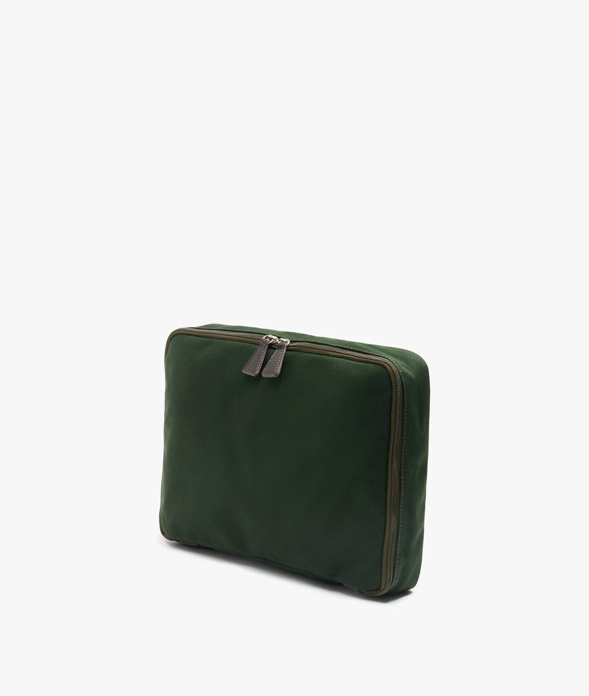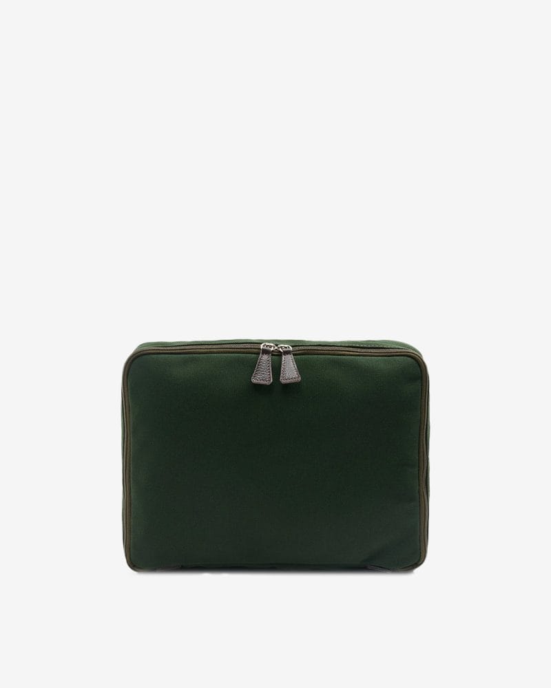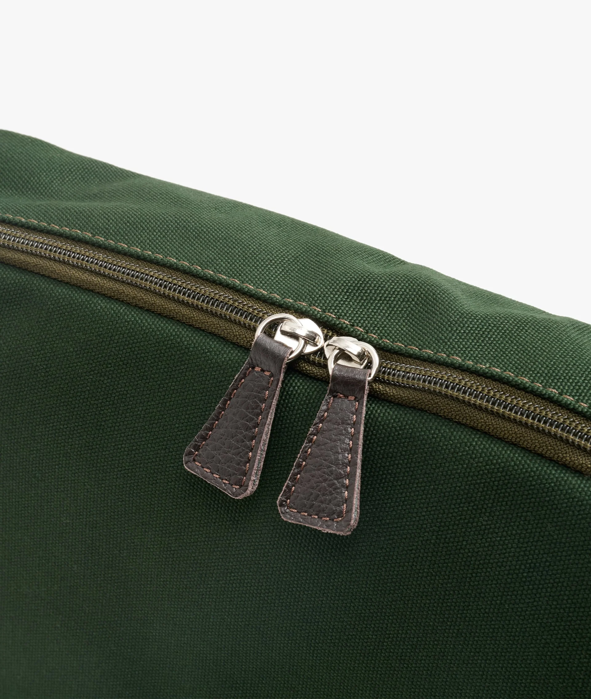 Etuiet åpnes enkelt med glidelås på tre sider, slik at det er lett å ta utstyret inn og ut. Innsiden er fôret med myk bomull, og utsiden kommer i kraftig mørkegrønn bomullscanvas. Mørkebrune skinndetaljer gir vesken et gjennomført og elegant uttrykk – praktisk og pen på samme tid.