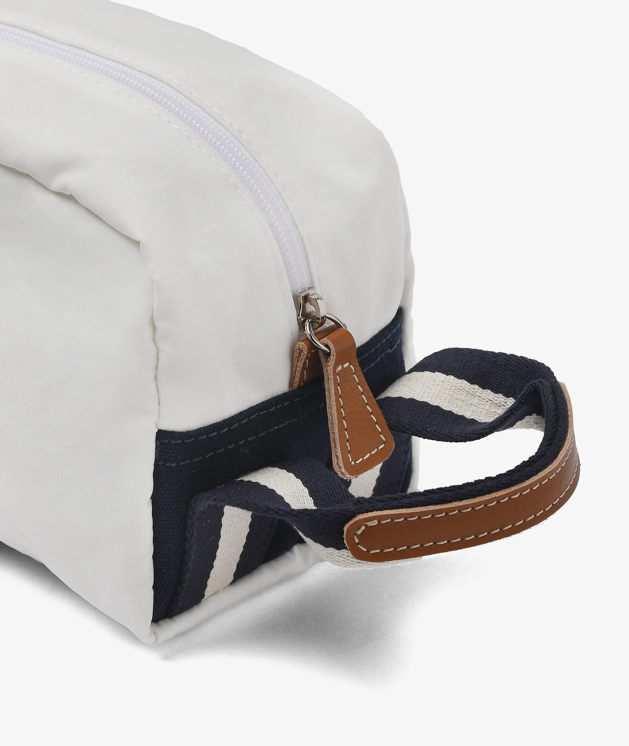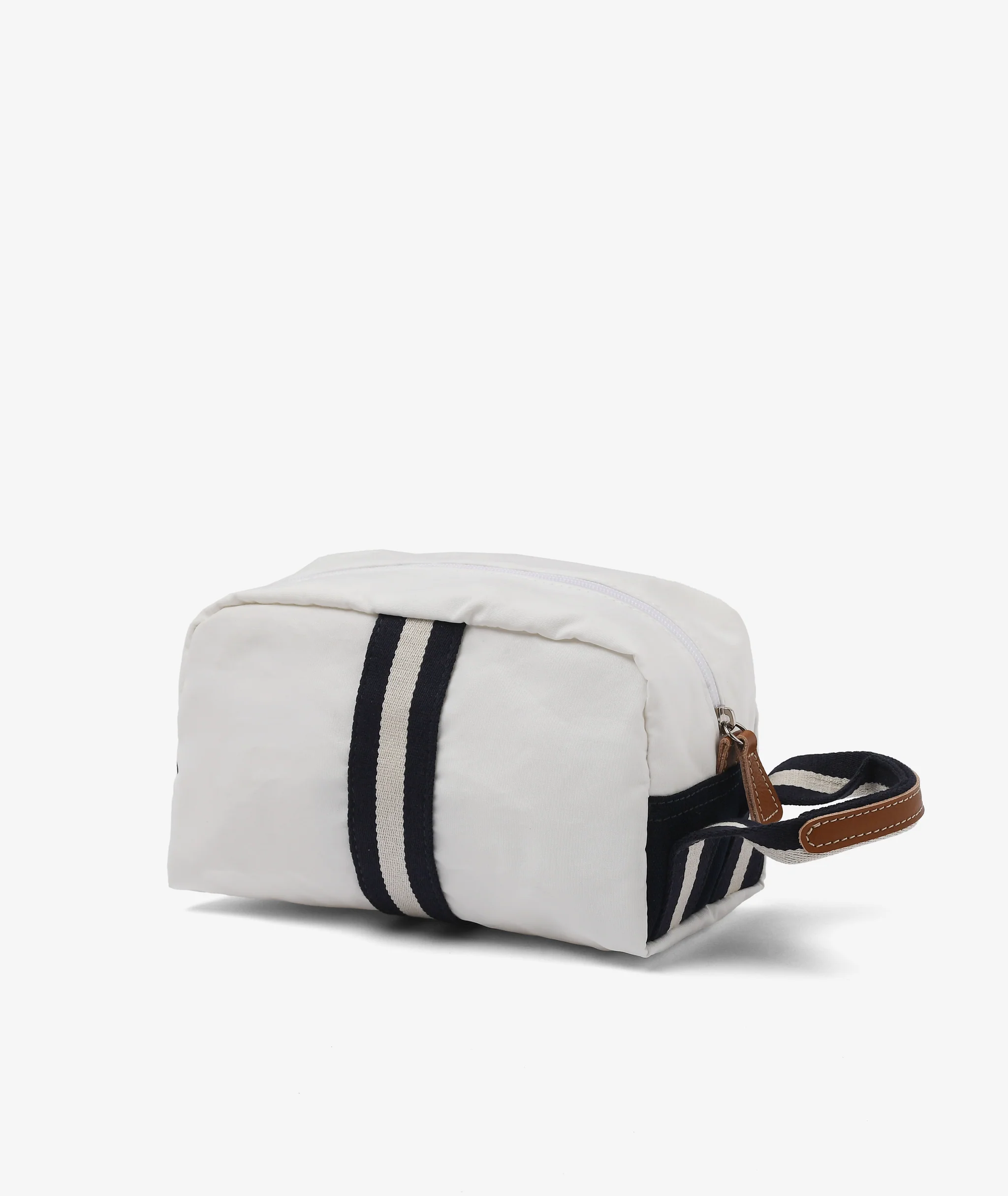 Boston toalettmappe i lys lin er en klassisk og praktisk reisevenn med tofarget gros-grain bånd i natur og mørkeblått, brune skinndetaljer og vannavstøtende fór. Modellen er unisex og romslig nok til det meste.